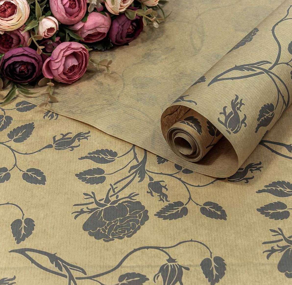 Бумага крафт упаковочная для подарков/цветов (принт "Вьющиеся розы" крафт/серый), 70см*10м
