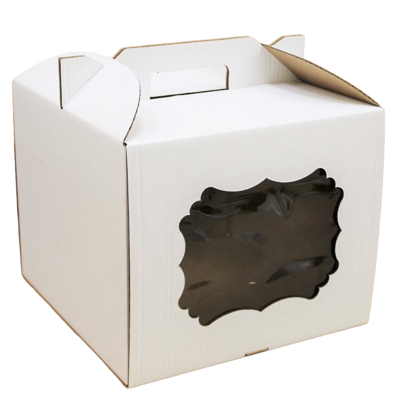 Стандартные коробки с фигурным окном и ручками, предназначенные для средних и больших тортов весом 2,5-3 кг.