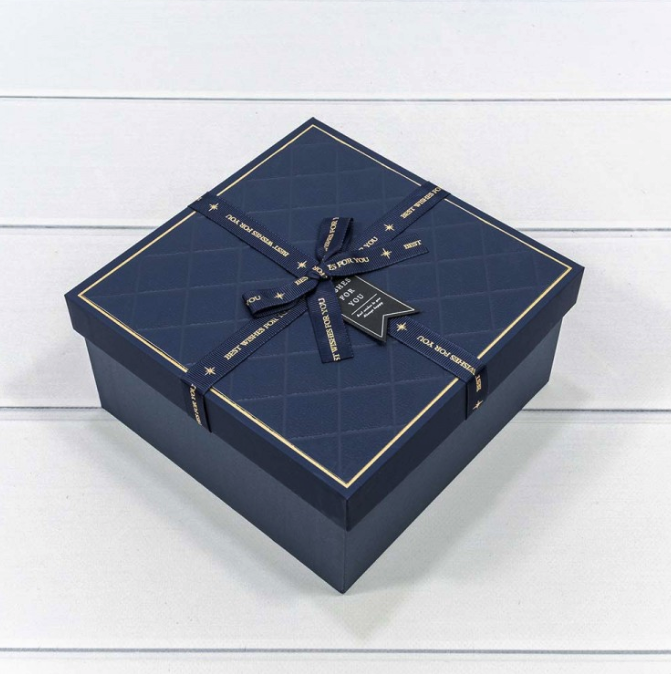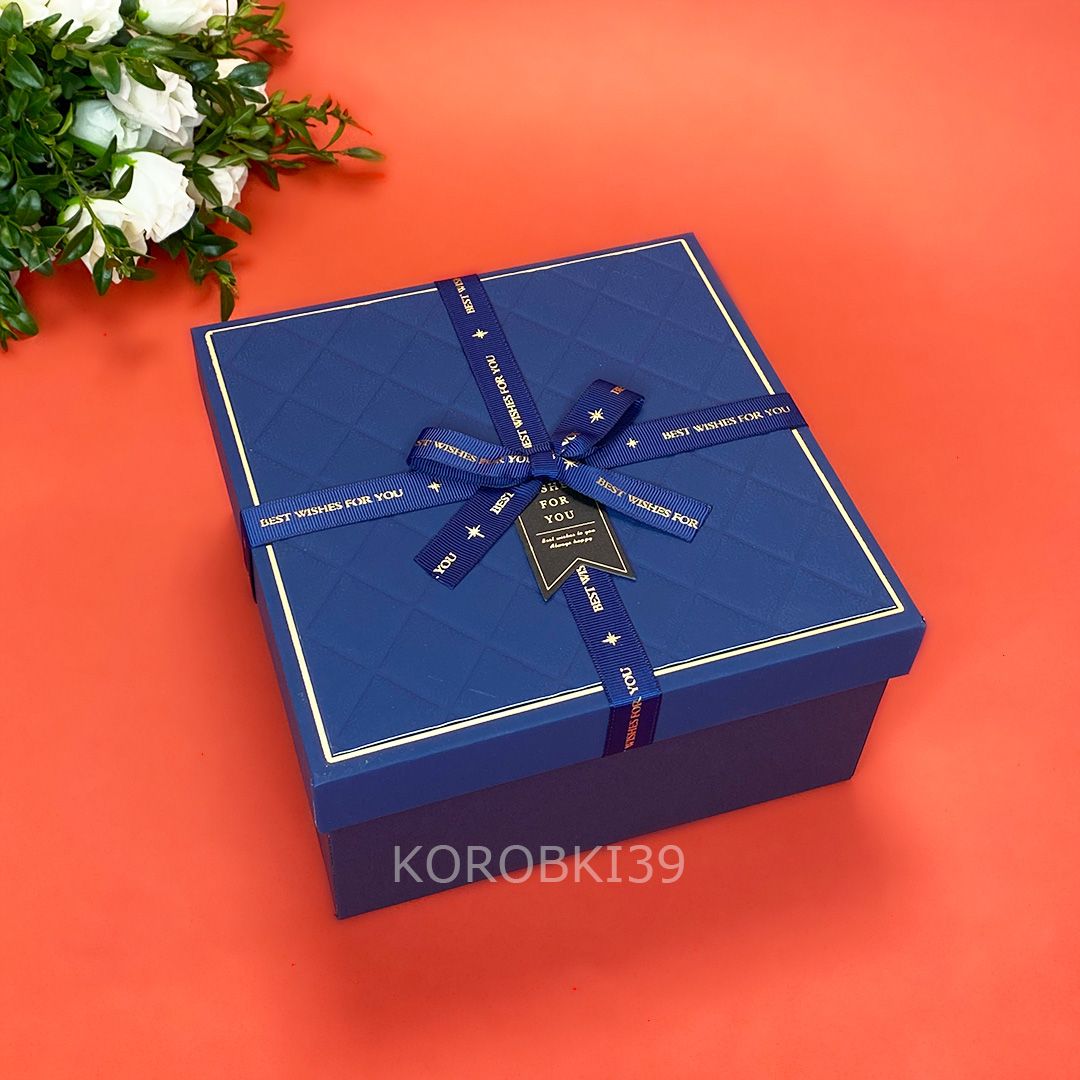 Коробка подарочная с бантом и лентой "Best wishes for you" (тем. синяя), 15*15*6,5см