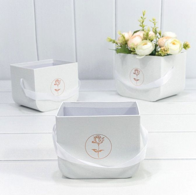 Прямоугольная коробка-кашпо с закругленным дном и ручкой из атласной ленты