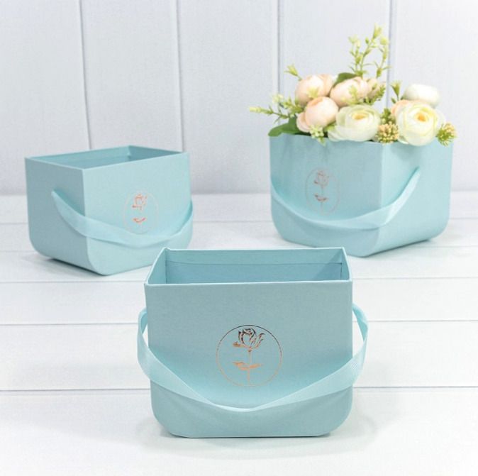 Прямоугольная коробка-кашпо с закругленным дном и ручкой из атласной ленты