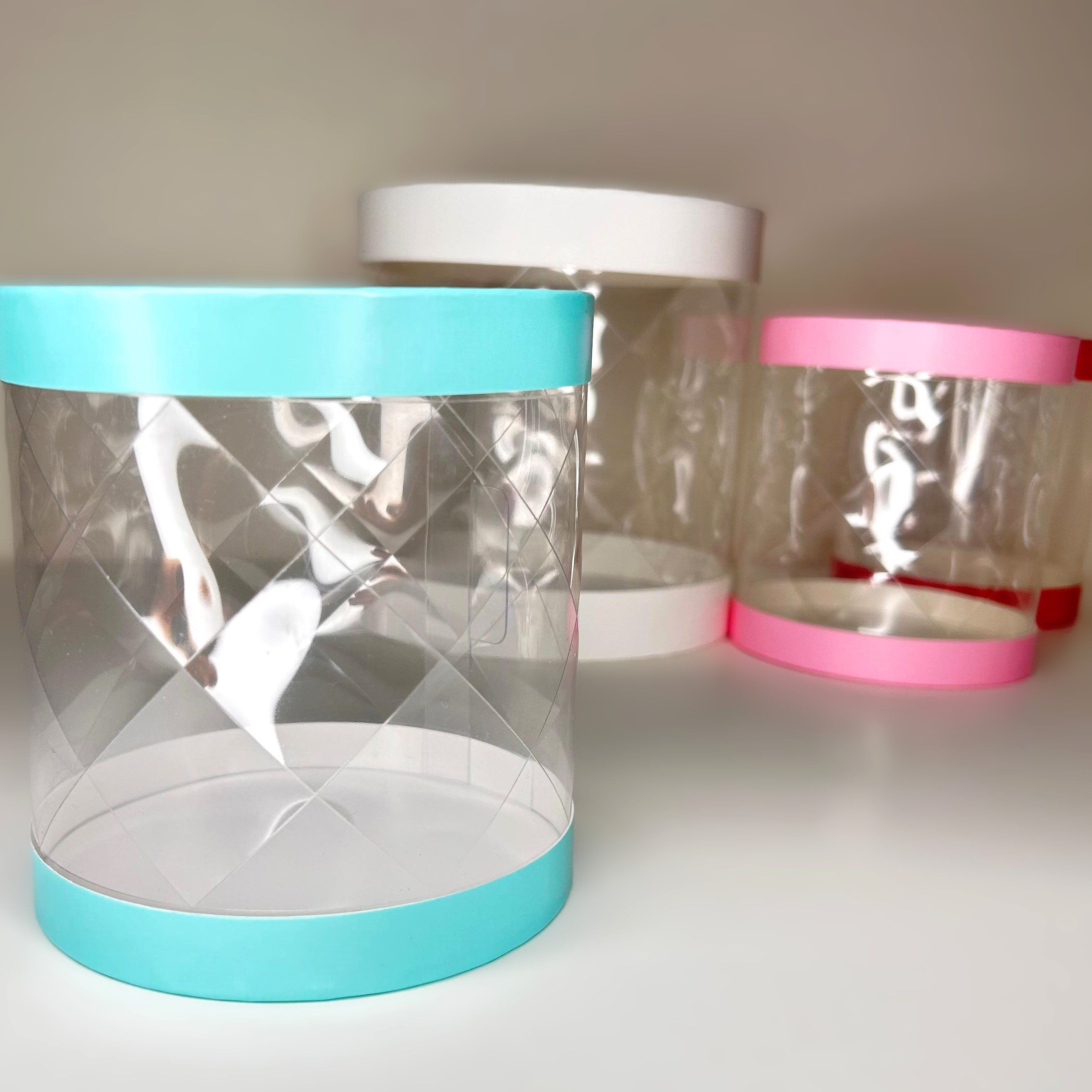 Круглые коробки-тубусы, предназначенные для бенто-тортов, с полностью прозрачной боковиной с узором